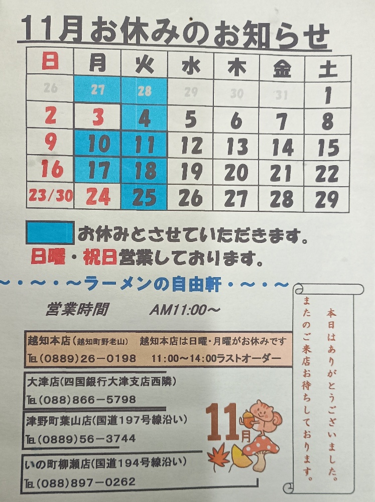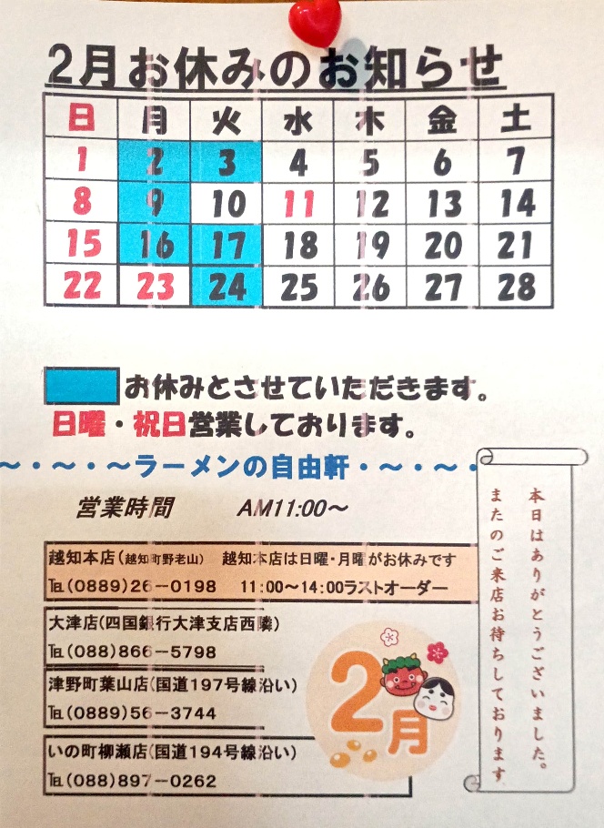 | 各支店名 | ①自由軒 伊野出来地店 ②自由軒 大津店 ③自由軒 葉山店 |